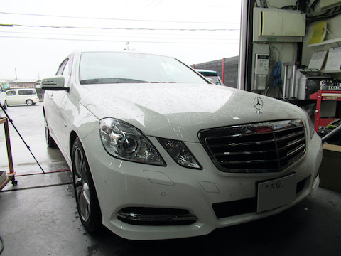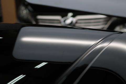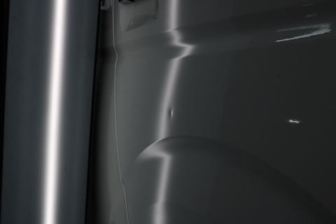 ベンツのE220dのお客様、左のクォーター部分にたてすじの薄いヘコミ。