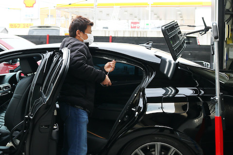 窓ガラスの隙間に、デントリペアの特殊工具を挿入し、
