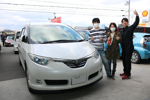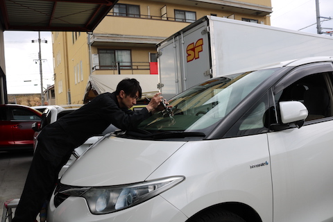 大阪市よりエスティマのお客様、フロントガラスに飛び石被害でご来店。