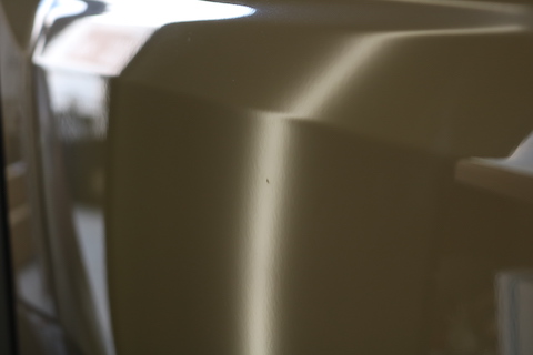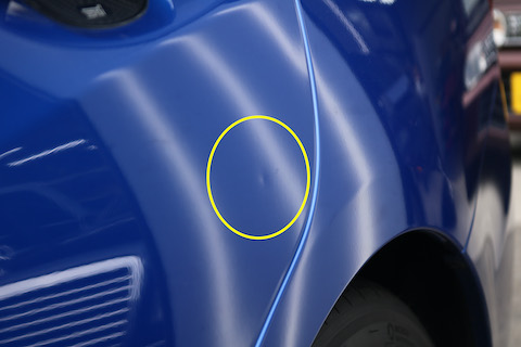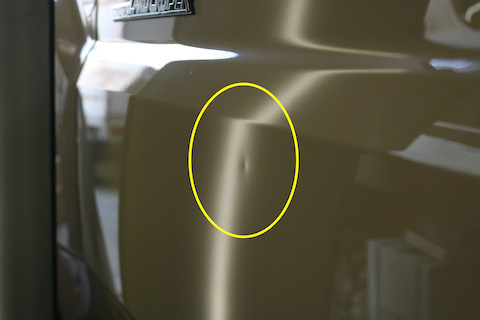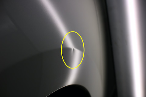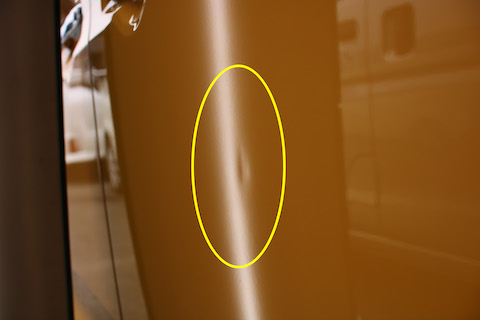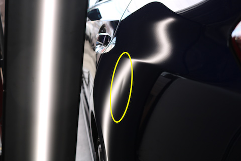 そして、左後ろタイヤ上あたりのクォーターパネル部分にもヘコミ。