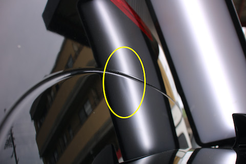 リアゲート上部分のスポイラーとの間部分にヘコミ。