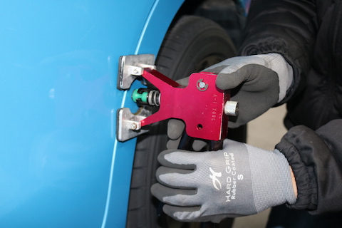 特殊な接着剤を使って工具をヘコミ上に引っ付けて引っ張り出します。
