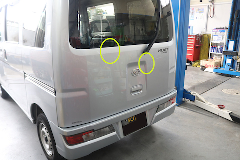 こちらのハイゼットのお客様、リアゲートに2箇所へこみがありました。