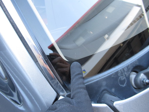 窓ガラスの隙間から工具を入れて、ヘコミを押し出しながら鉄板を成形し、