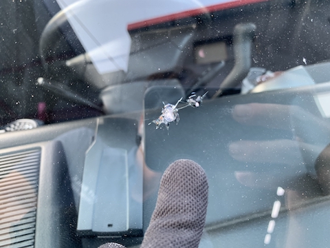 大きな飛び石被害で、今にもひびが伸びそうです!