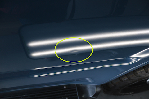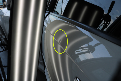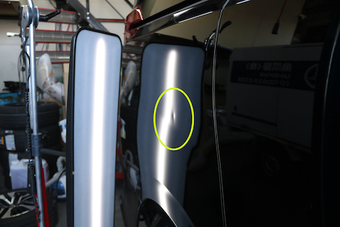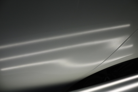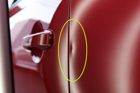 助手席ドア後ろあたりのクォーターパネル部分にエクボのへこみ。