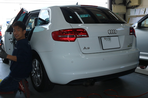 アウディのお客様、左リアドアにへこみがあるとのことでご相談。
