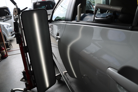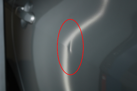 これもドアパンチ被害でしょうか、縦筋のヘコミ。