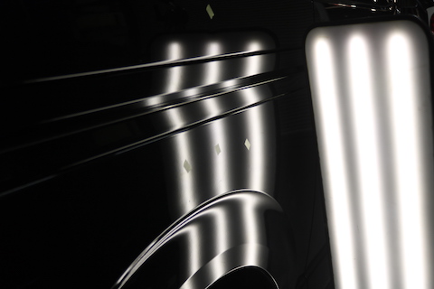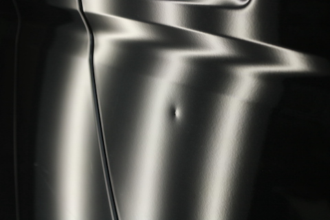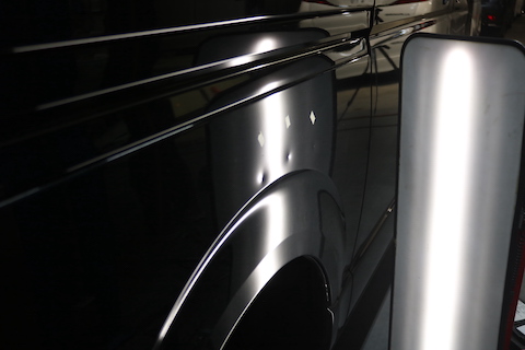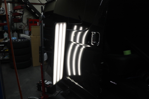 特殊な工具を挿入して、へこみを少しづつ押して鉄板を整え、
