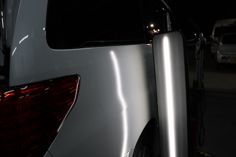 アルファードのお客様、リアタイヤ上あたりにあったへこみ相談でご来店。
