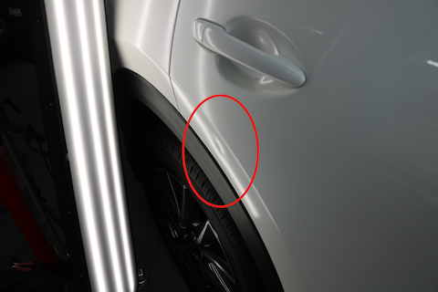 右リアタイヤ上あたり、クォーターパネル部分にへこみができてしまったとご相談。