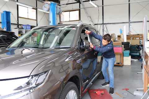 歪んだ鉄板を押すだけで戻せるので、パテや塗装を一切使わない、