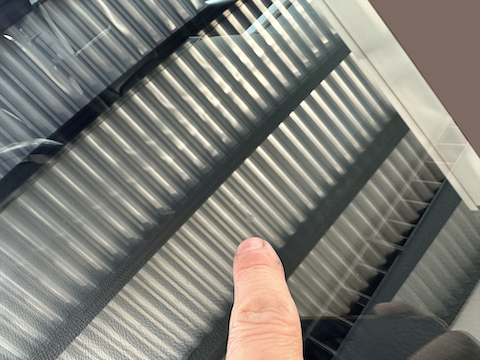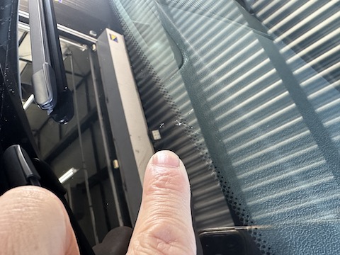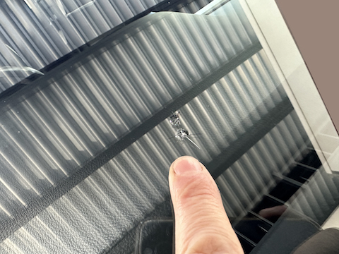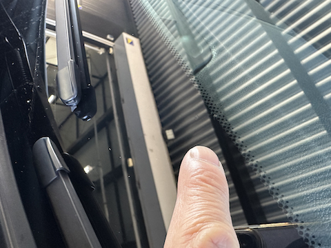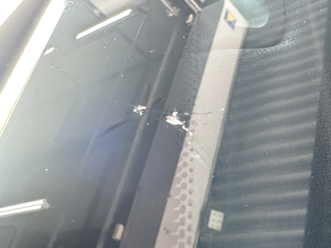 フロントガラス下側の黒い部分に飛び石被害でひび割れ。