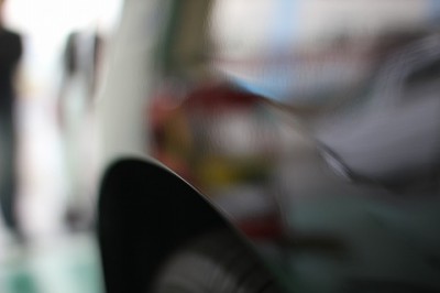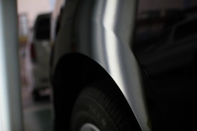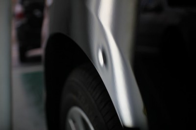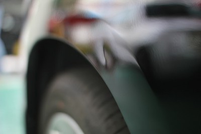 | 自転車のグリップか何かが当たったとの事でした。蛍光灯を当ててへこみを 確認すると、歪な形をしてへこんでおりました。 | この場合、フロントフェンダー部分の裏側のカバーを外して裏側から押し出して いきます。 | |