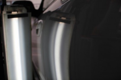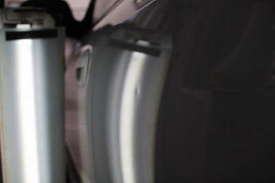 | この場合は、ガラスを下ろし、ウインドパットでガラスを保護して、エアパットを使 ってボディとガラスに1cm程度、隙間を作ります。そこから、デントリペアツール を入れて、ガラスを支点にテコの原理でへこみを裏側から押し出していきます。 | きっちり完成でございます。 少しお待ち頂いている間に終ります。 | |