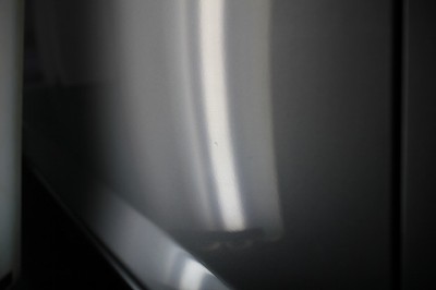 | こちらはフロントドア下部に傷を伴った少し深めのへこみです。 | へこみはちょうどドアの補強部分でしたが、内張りを外して短時間で復活する ことができました。 | |