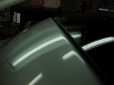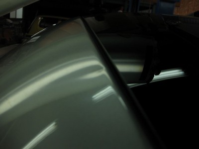 | リヤガラスのプレスライン上もへこんでおりました。 何かが強く当たったのでしょう。衝撃点にはキズが入っておりました。 | この場所は裏側の内張りを外せば、デントリペアツールのアクセスは問題ありま せん!! | |