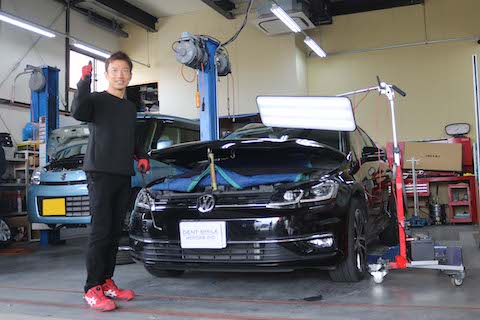 ゴルフのボンネットのへこみをちょっと待つ間に修理!