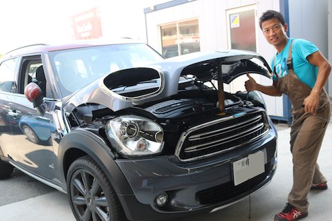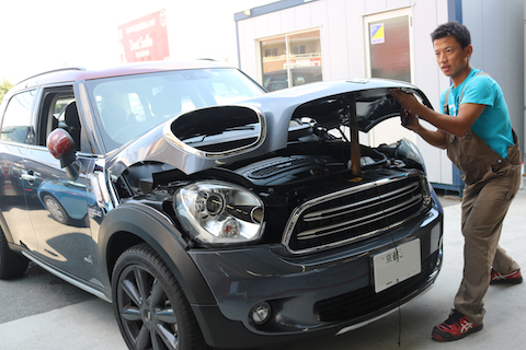 京都よりBMW ミニのお客様、飛び石でボンネットにヘコミ!