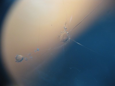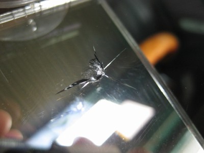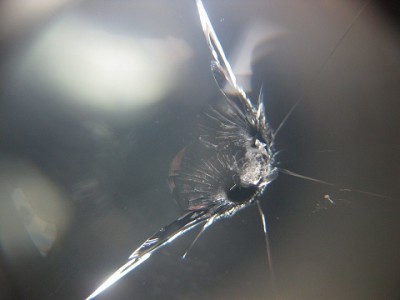 | バシッともの凄い音とともにこの割れキズがフロントガラスに。。。 これは拡大して撮影しております!! | ||